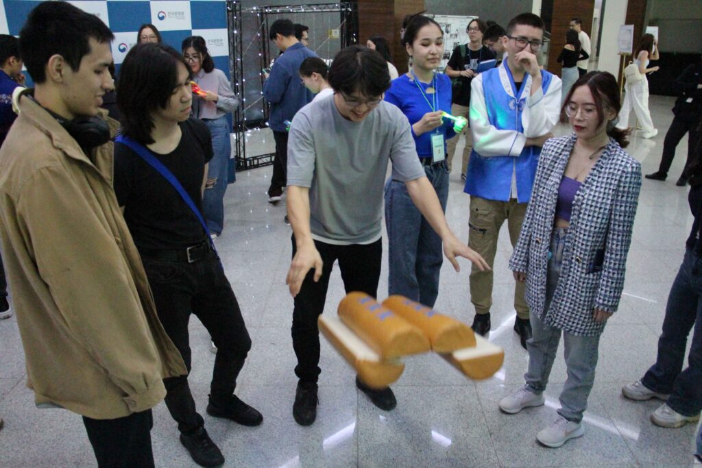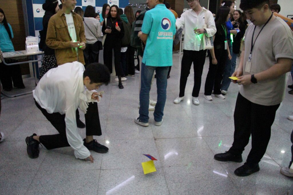 한국 놀이 체험 부스에서는 한국의 전통놀이인‘윷놀이’와‘딱지치기’를 선보였다. 윷놀이는 팀별로, 딱지치기는 개인별로 진행되었으며,‘윷놀이’대결에서 우승한 팀과‘딱지치기’를 3개 이상 성공한 참가자에게는 선물로‘훈민정음’해례본의 문양이 새겨진 볼펜을 지급하였다. 학생들은 기념품을 받기 위해 전통 놀이를 여러 차례 도전할 정도로 관심과 열정을 보였다.