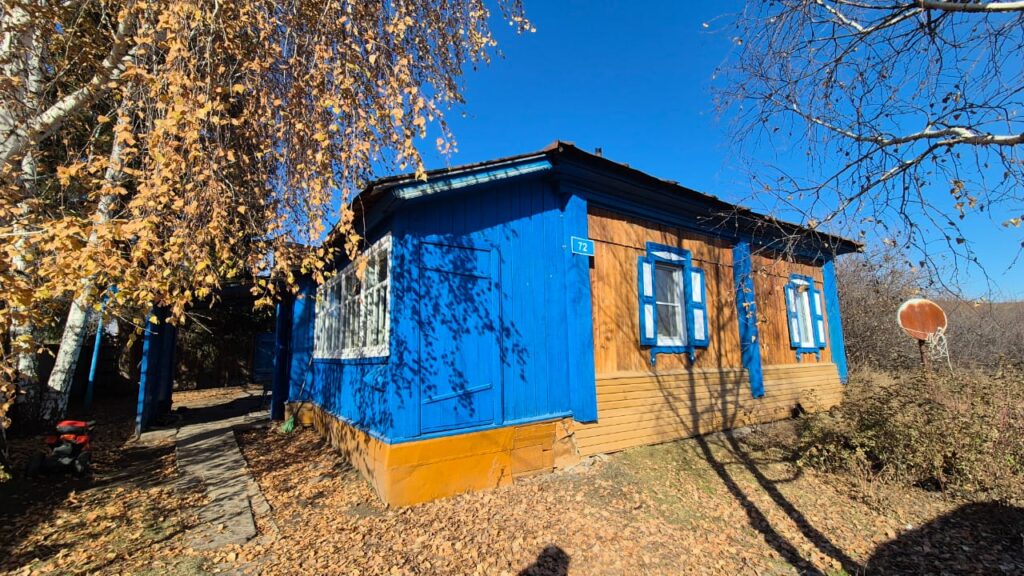 알타이 산맥 남쪽 능선을 향해 점차 고도를 높여 나가던 중, 산꼭대기를 덮고 있는 흰 눈이 원경을 이루고 노랗게 단풍이 든 자작나무 숲이 중경을 이루는 속에 듬성듬성 자리 잡은 파란색 집들이 너무 아름다워 잠시 차를 세웠다.