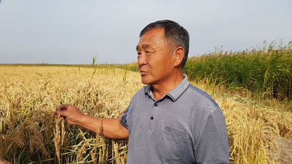 <박박디 꼴호즈 수리조합장인 김 블라지미르씨가 추수를 앞둔 논에서 벼작황을 설명하고 있다.  사진 : 김상욱>